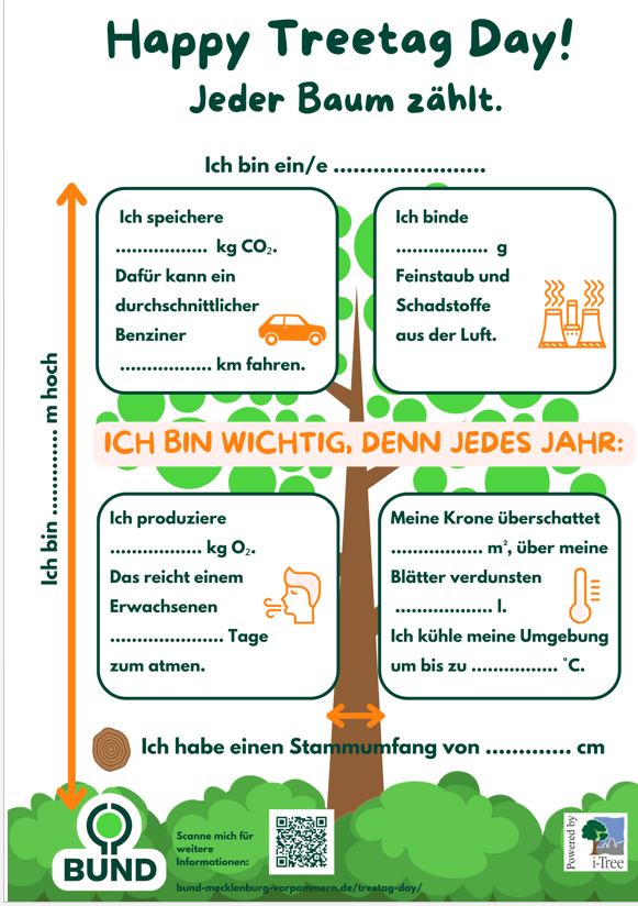 Diese öffentliche Aktion ist Teil des Treetag-Projekts des BUND Mecklenburg-Vorpommern. Ziel ist es, den ökologischen Wert von Bäumen sichtbar zu machen und die öffentliche Diskussion um Baumschutz und Klimaanpassung mit Fakten zu bereichern. Zum Treetag Day wenden wir uns den Bäumen in der Ortsdurchfahrt Stove zu, deren Bestand durch die Erneuerung der Straße gefährdet ist. Nachdem die Bäume bereits von uns vermessen und die Ergebnisse digital ausgewertet wurden, bringen wir am Treetag Day die sogenannten „Treetags“ oder Baumpässe an den Bäumen an. Dadurch werden ihre Ökosystemleistungen – wie Sauerstoffproduktion, CO₂-Speicherung und Feinstaubfilterung – für alle greifbar dargestellt. ==> Ab 9 Uhr sind wir in Stove bei den Bäumen. Wir bringen die Treetags (Baumpässe) an den Bäumen an. ==> Um 11 Uhr begrüßen wir die Gäste und alle interessierten Menschen. Es erfolgt die Vorstellung der Treetag-Kampagne durch Jasmin Personn/BUND MV und wir machen einen kleinen Allee-Spaziergang zu den Bäumen. Bitte tragt aus Sicherheitsgründen eine Warnweste – danke!